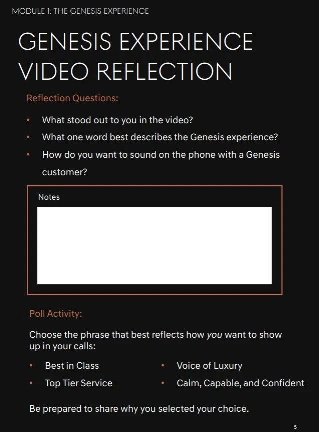 Designed to transition agents to concierge-level service, emphasizing polish, and proactive problem-solving aligned with the Genesis brand.